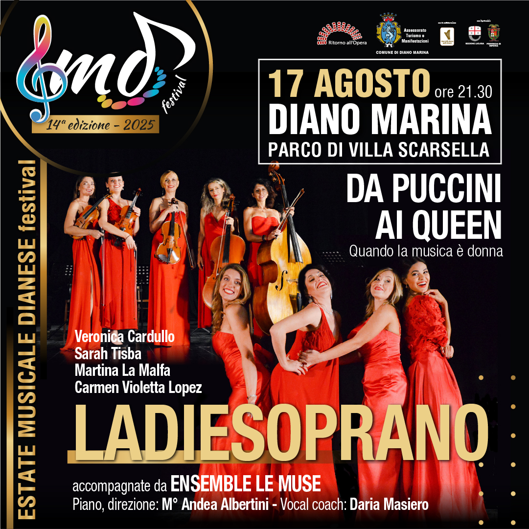 Diano Marina. Domenica 17 agosto alle 21.30, nel parco di Villa Scarsella, il 14° Emd Festival propone lo spettacolo “Quando la musica è donna, da Puccini ai Queen”, unica data ligure del 2025. Protagoniste saranno le quattro cantanti del quartetto LadieSoprano e le cinque strumentiste del quintetto d’archi Le Muse, con Andrea Albertini al pianoforte e alla direzione.