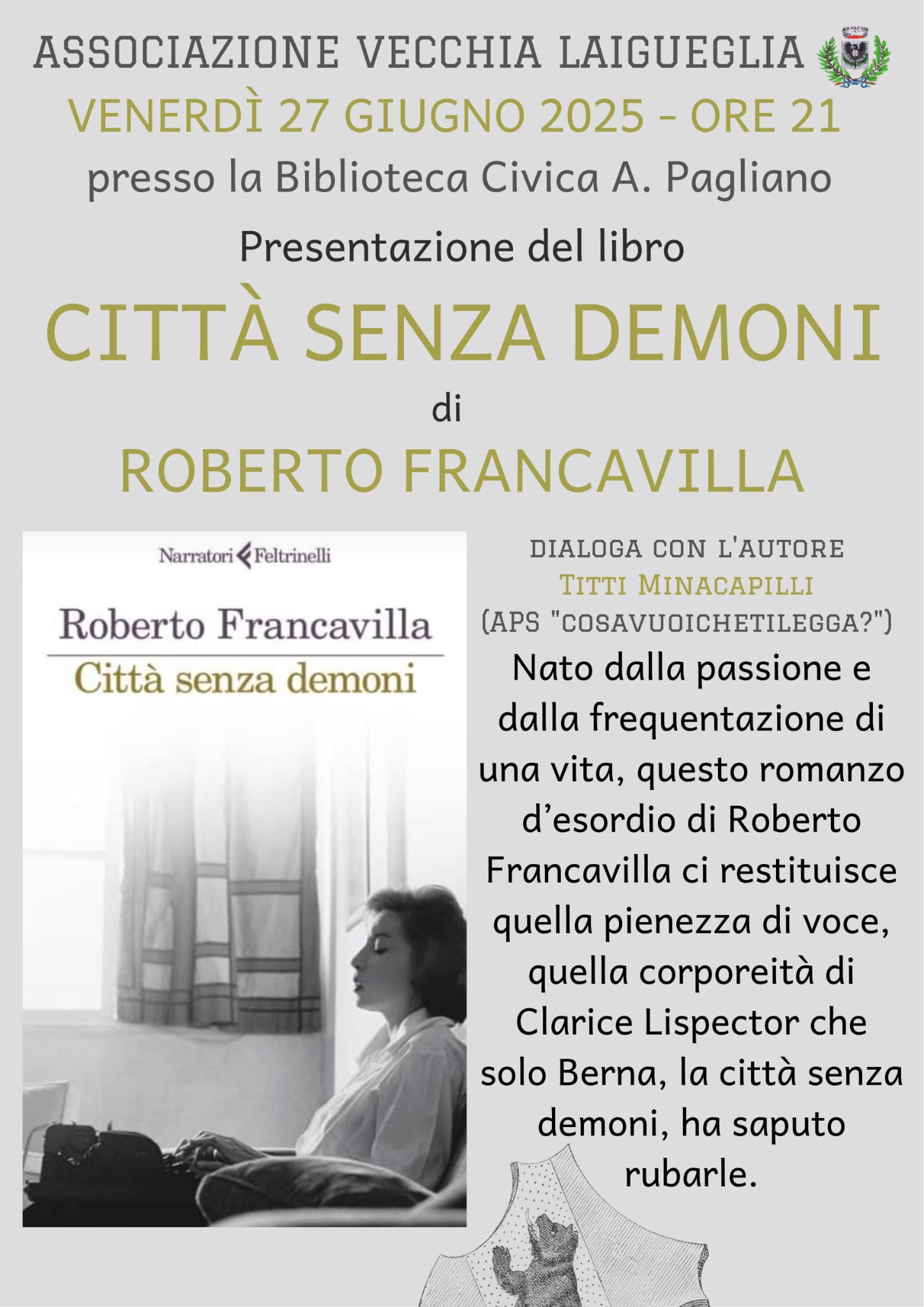 Laigueglia. S’intitola “Città senza demoni”. E’ il libro di Roberto Francavilla che sarà presentato venerdì 27 giugno alle 21 alla biblioteca civica Pagliano di Laigueglia, evento promosso dall’Associazione Vecchia Laigueglia e patrocinato dal Comune. A dialogare con l’autore sarà Titti Minacapilli. Il romanzo di Francavilla è un atto d’amore per Clarice Lispector, scrittrice di culto. «Chi fugge nella neve lascia sempre qualcosa dietro di sé, lei lo sapeva bene». Così commenta Alessandro Chirivì, capogruppo di maggioranza e delegato al calendario delle manifestazioni ed alla cultura: «Ancora un interessante appuntamento letterario del venerdì organizzato dall’Associazione Vecchia Laigueglia in collaborazione con l’amministrazione comunale; le presentazioni dei libri nella splendida cornice della nostra biblioteca sul mare non andranno in vacanza ma continueranno per tutta l’estate, passando al più fresco orario delle 21 fino al mese di settembre, quando torneranno al consueto appuntamento delle 18.
