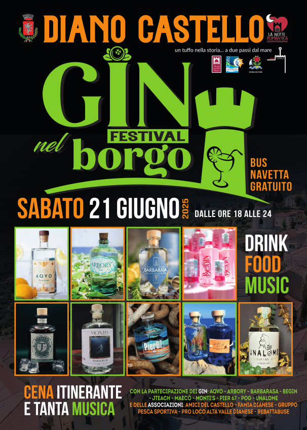 Diano Castello. L’apertura dell’estate, a Diano Castello, è all’insegna di drink, food & music. Sabato 21 giugno va in scena, per la terza volta, Gin nel Borgo Festival, l’evento dedicati ai distillati di bacche di ginepro fortemente collegati con il territorio e connotati dalla presenza di botaniche e materie prime tipiche della nostra regione. Appuntamento, dalle ore 18 alle 24, in piazza Matteotti e in varie location del centro storico con cena itinerante e proposte musicali di diverso genere, per trascorrere una piacevole serata tra vie e le piazzette di uno dei Borghi più belli d’Italia. L’iniziativa, promossa dall’amministrazione comunale di Diano Castello, è in programma dalle ore 18 alle 24, con servizio di bus navetta gratuito (capolinea in via Cesare Battisti, angolo via Capocaccia, a Diano Marina e all’ingresso del borgo di Diano Castello).