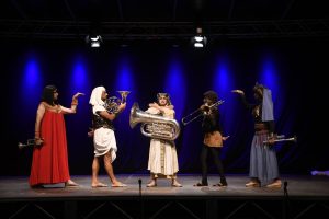 Fiore all’occhiello del repertorio del Gomalan Brass Quintet, il progetto Aida, è la grande sfida che il quintetto lancia all’inespugnabile fortezza della lirica: cinque musicisti in abiti di scena suonano, cantano, interpretano, recitano, ballano l’opera, trasformandosi di volta in volta in Aida, Radames, Amneris, Il Faraone, Amonasro, in un rapido susseguirsi di arie, musica e prosa. Non per ridicolizzare un capolavoro, ma per renderlo fruibile e comprensibile a chi non lo conoscesse (bambini compresi) o per farlo apprezzare ancora di più a chi ne sapesse già decodificare linguaggio e intenzioni. Deliziosi arrangiamenti per quintetto collegati tra loro da scene recitate che accompagnano l’ascoltatore nella fitta trama della vicenda. Musica, danza e mimo sono gli ingredienti di questo divertissement al contempo comico e serio.
