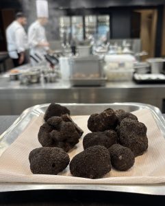 Nel pomeriggio l’attenzione si è spostata sull’Hotel Europa Palace con una sessione riservata al mondo della comunicazione. Dopo un’analisi sensoriale guidata da Romagnolo, spazio allo show-cooking firmato da Serale e Schiavon. Quattro le portate presentate, tutte impreziosite dal Tartufo Nero Pregiato del Cuneese: uovo cotto a bassa temperatura con crema di sedano rapa e nocciola piemontese; risotto alla robiola di Roccaverano con gambero rosso di Sanremo; faraona ripiena di scampi; ganache bianca ai porcini e caffè. Un percorso gastronomico che ha unito prodotti di terra e di mare, sottolineando la versatilità del tartufo nero, meno costoso e più facilmente utilizzabile in cucina rispetto al tartufo bianco.