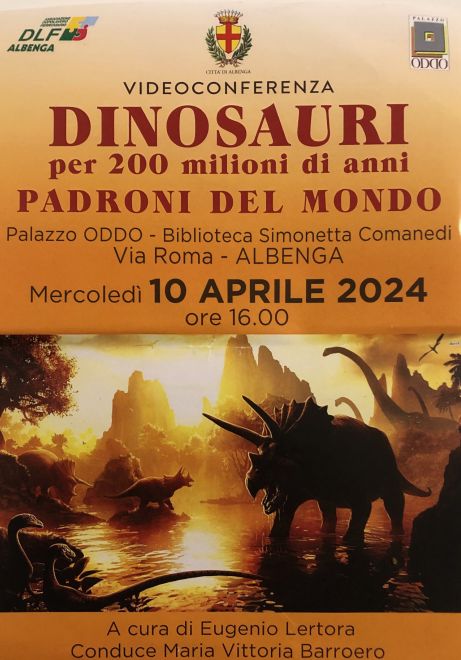 Alle ore 16, nella sala incontri della biblioteca civica Simonetta Comanedi, con il patrocinio della Fondazione Palazzo Oddo e del Comune di Albenga, il DLF locale proporrà Dinosauri per 200 milioni di anni padroni del mondo.
