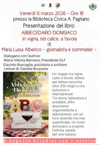 Laigueglia. Venerdì 6 marzo 2026 alle ore 18 la Biblioteca Civica “A. Pagliano” di Laigueglia ospiterà la presentazione del libro Abbecedario dionisiaco. In vigna, nel calice, a tavola di Maria Luisa Alberico, giornalista e sommelier. L’iniziativa è organizzata dall’Associazione Vecchia Laigueglia, dall’Associazione DLF Albenga e dal Centro Pannunzio di Torino e propone al pubblico un incontro dedicato alla cultura del vino, inteso non solo come prodotto ma anche come racconto, tradizione e momento di convivialità.