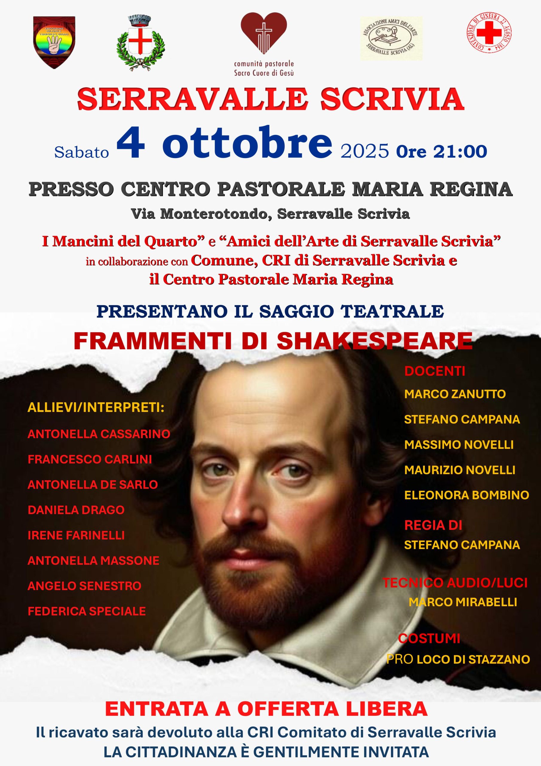 Serravalle Scrivia. Sabato 4 ottobre alle ore 21 il Centro Pastorale Maria Regina di via Monterotondo ospiterà il saggio teatrale Frammenti di Shakespeare, promosso dall’Associazione “I Mancini del Quarto” e dagli “Amici dell’Arte di Serravalle Scrivia”, con la collaborazione del Comune, del Comitato CRI di Serravalle Scrivia e della stessa struttura parrocchiale.