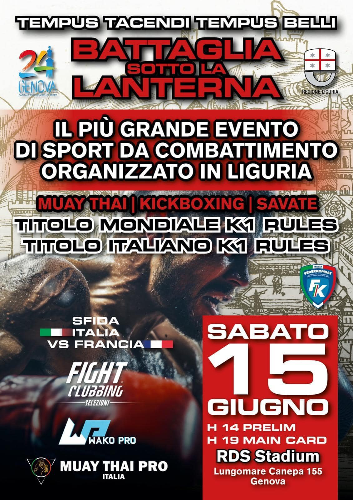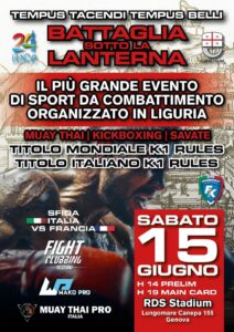 Genova. Sabato 15 giugno, allo Stadium Genova, andrà in scena “Tempus tacendi, tempus belli. Battaglia sotto la Lanterna”, evento inserito all’interno del programma “Genova 2024 Capitale Europea dello Sport” con organizzazione a cura del Comitato Regionale della Federkombat.